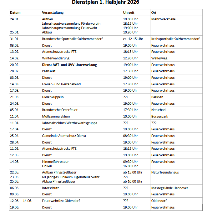 Dienstplan Einsatzabteilung 1. Halbjahr 2026